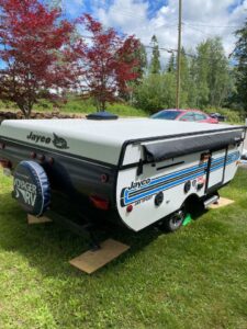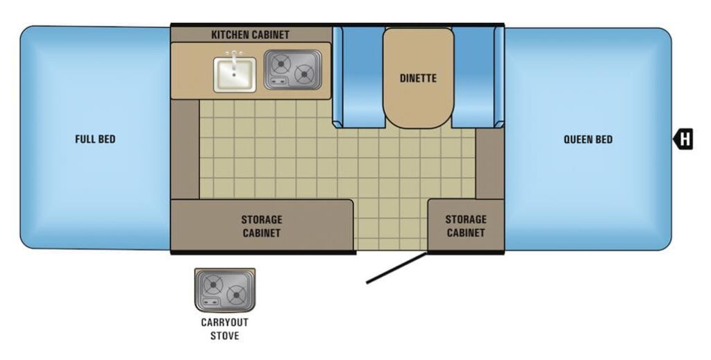 - A lightweight, versatile tent trailer with a dry weight of 1,455 lbs and GVWR of 2,000 lbs. Sleeps up to 6 across queen and full bunk ends plus a booth dinette. Equipped with a 10-gal fresh water tank, 4.7 gal (20 lb) propane tank, 16,000 BTU furnace, two-burner range, 2-cu ft gas/electric fridge, awning prep, and durable tent fabric with 1,050-lb rated beds. Perfect for budget-friendly, family camping adventures.