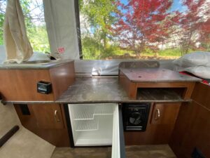 - Furnished with a kitchenette, dinette that goes into a bed, bathroom, a jack knife couch that folds into a bed, over the cab queen sized bed and a bedroom with a walk-around queen-sized bed. Big Slide-out. Auto Ignite Furnace, A/C. Complete water system including Fresh Water Tank. Auto Ignite Water Heater. 3 piece Bathroom: toilet, sink, shower with tub. Refrigerator with separate freezer. Propane Cooktop, Oven. Built-in Generator. Everything has been maintained and in good working order.