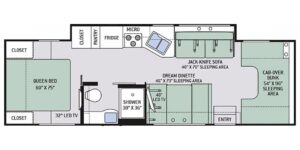 - Features one slide-out, queen rear bed, over-cab bunk, dinette sleeper, full kitchen, bathroom with shower, Onan generator, 55-gal fuel tank, 50-gal fresh water, 28-gal gray/black tanks, large exterior storage, power awning, A/C, furnace.