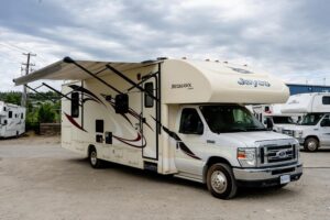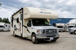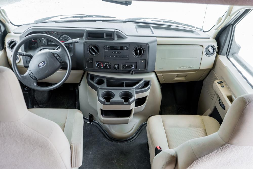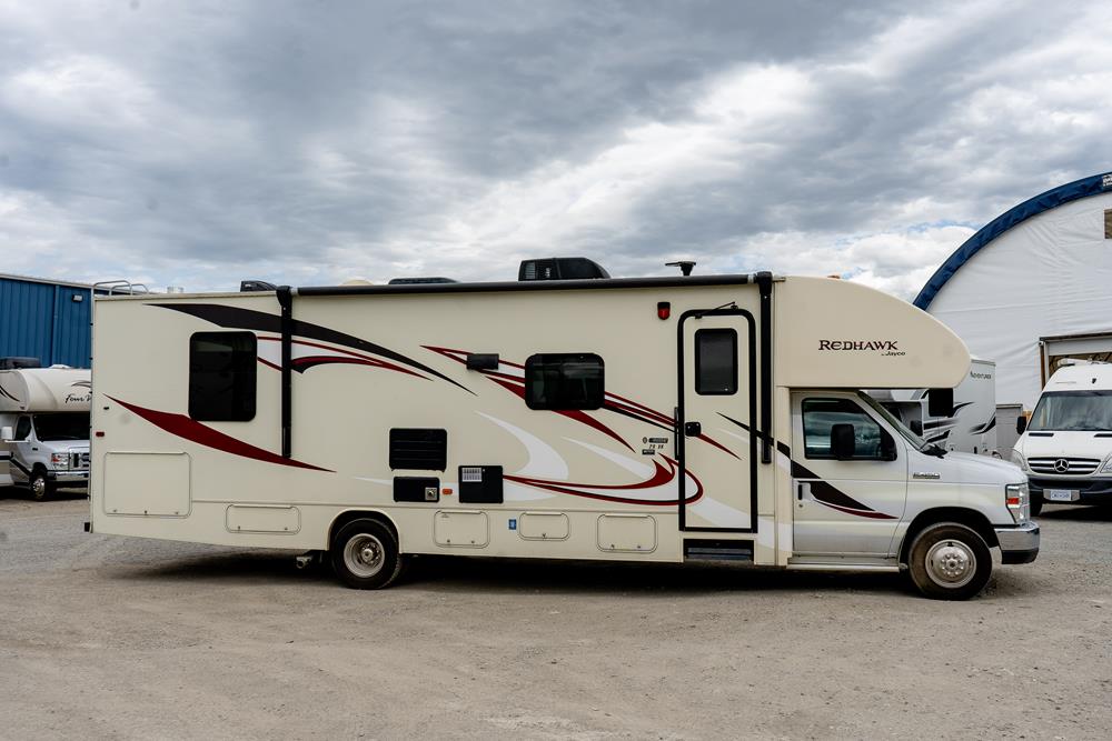 - 29' Class C motorhome on Ford E-450 chassis with Triton V10 engine. Features include single slide-out, walk-around queen bed, over-cab bunk, jackknife sofa, booth dinette, kitchen with gas stove and microwave, 8 cu. ft. fridge, Onan 4,000W generator, private bathroom, backup camera, power awning, A/C, furnace, and large exterior storage compartments.
